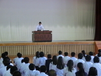 終業式では、高見敏彦校長が、1学期の生徒の頑張りや、全国高校野球選手権島根大会における野球部生徒の最後まで諦めないひたむきなプレー、吹奏楽部の一生懸命な演奏、3年生、生徒会執行部をはじめとする有志生徒による団結力のある応援等を賞賛し、労をねぎらう言葉をかけました。そして、高見校長は「『がんばる、努力する』というのは、戦うこと。では何と戦うのか。戦う相手を明確にすることが大切。それは自分自身。この夏、自分の弱い部分としっかり向き合うこと。」と述べました。