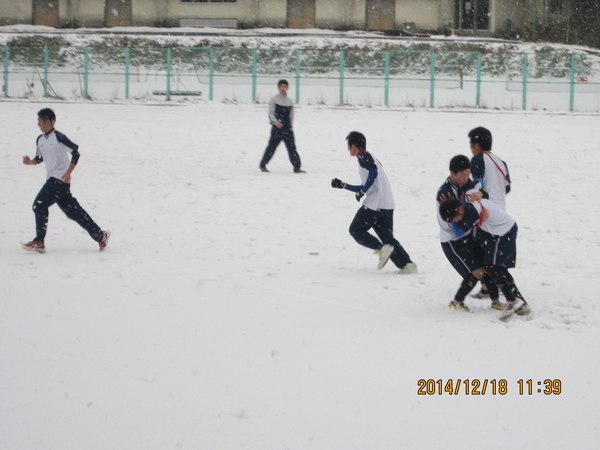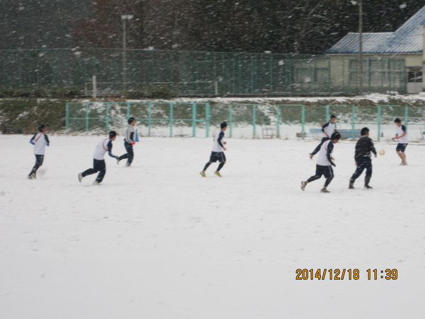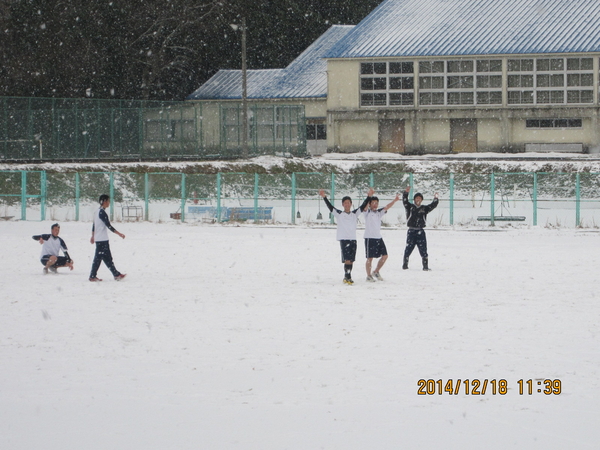 12月18日(木)前日からの雪が降り続く中、体育でサッカーをしています!若さと元気みなぎる3年生男子でした。