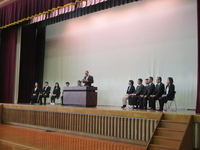終業式では、福間俊行校長が、平成27年度をまもなく迎えるにあたり、新3年生は進路決定に向けて充実した日々を送ること、新2年生は中核学年としての自覚を持って行動するように激励しました。
