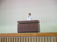 島根中央高校で働けることを幸せに思います。そして、皆さんが英語を学ぶのを手伝い、皆さん全員とお知り合いになることを楽しみにしています。一緒に、楽しく英語を勉強しましょう。」と英語で日本、島根中央高校、日本語、英語教育等への想いを語りました。