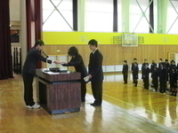 降雪・積雪で大変寒い中でしたが、生徒は終始落ち着き、緊張した面持ちで表彰式と終業式に参加していました。最後は、吹奏楽部の演奏で校歌を歌い、生徒・教職員共に3学期に向けて決意を新たにしました。