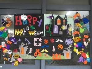 3年生の「児童文化」「課題研究保育」選択者が、ハロウィンの壁面構成を行い、昇降口に展示しました。