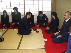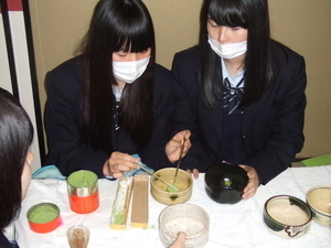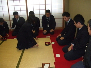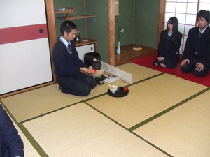 12月10日(木)に、2年地域創造コースの生活総合文化基礎の授業で、3年地域創造コース、現代ビジネスコースの生徒を招いての「おもてなし茶会」を行いました。当日は先生方にも足を運んでいただき、程よい緊張感の中で日頃の授業の成果を披露することができました。