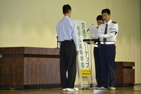 最初に川本警察署長のあいさつがあり、指定書が生徒代表に手渡されました。その後、交通安全リーダーに選ばれた生徒に委嘱状が手渡されました。生徒会長は「学校・家庭・地域の連携の下、今後さらに交通安全意識を高め、高校生としての責任を果たしたい」と決意を表明しました。