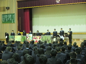 部活動紹介では、文化部7部・運動部9部及び家庭クラブ、しまんchu♥!、生徒会執行部の活動紹介がありました。パソコンを使ったプレゼン・クイズ・寸劇などそれぞれ工夫を凝らしたパフォーマンスを披露し、体育館は大いに盛り上がりました。