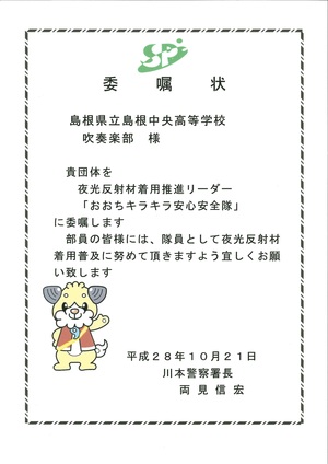 10月21日(金)の放課後、川本警察署より委嘱を受けた本校の吹奏楽部が、インフォメーションかわもと先の国道261号線において大型広報検問に参加しました。