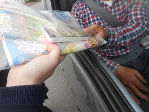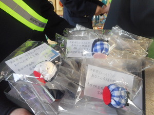 生徒たちは、検問を通る自動車のドライバーに早めのライト点灯、スピードダウンや夜行反射材の着用などの交通安全を呼びかけるとともに、家庭クラブの作成した根付を渡しました。